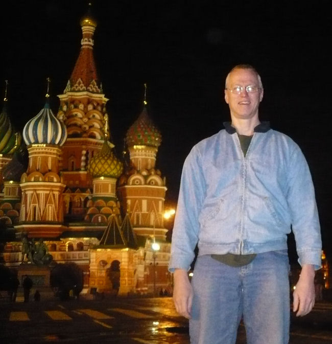 Andy Thayer of Chicago's Gay Liberation Network on Red Square in front of St. Basil's Cathedral, midnight, upon arrival in Moscow, May 13th.