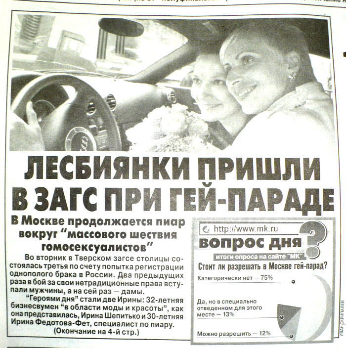 MOSCOW - A front page headline in Moskovskij Komsololets, one of Moscow's major dailies, on Wednesday read "Lesbians Came to Marriage Registration Bureau Before Gay Pride," with a sub-headline of "In Moscow, rise in publicity about gay pride."