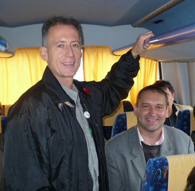 Peter Tatchell, Britain's foremost LGBT rights campaigner, on the coach to today's Slavic Pride conference.