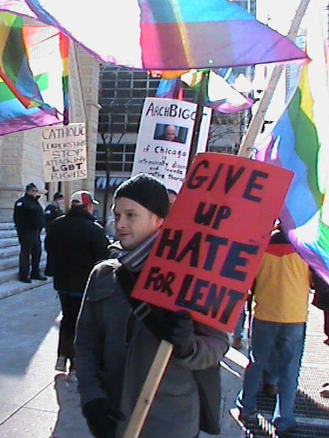 As equal marriage rights legislation moves forward in Springfield this year, we fully expect that Cardinal George will again align himself with those promoting anti-gay discrimination. And with discrimination comes hate, like night follows day, no matter what carefully-worded PR that George puts out.